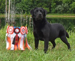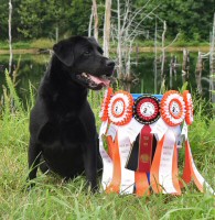 Bogie is a son of GCH CH Can CH U-CH Poplar Forest Play It Again Sam UD RE MH MHU, one of our most accomplished Labradors. Bogie is a stocky black dog with a true Labrador double coat and a very upbeat personality. He is friendly and playful, always ready for a game of fetch or a walk (or run!) around the farm.Bogie is a handsome and engaging male who easily completed his UKC Grand Championship, and will be competing in AKC Hunt Tests next spring. Bogie is a very solid 70 pounds blocky English build with moderate energy. He is OFA Hips Good, Elbows Normal, Patellas Normal, Eyes CAER (Clear), OFA Heart Clear (Echocardiogram), Full Dentition, PRA, RD Clear, EIC and CNM Clear, Clear for Dilute. CHIC 112350 See a copy of Bogie's OFA files.